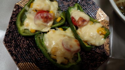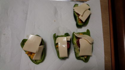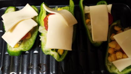 ピーマンの一番上に、スライスチーズを手でちぎりながらのせます。